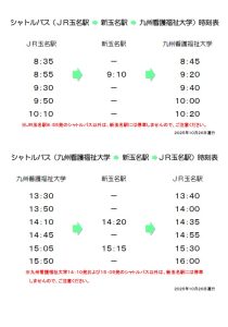 受験者の皆さんはご利用ください。なお、JR玉名駅からご利用をされる方は、新玉名駅を経由する便もございますので、ご乗車の際は、お時間に余裕をもってご利用ください。