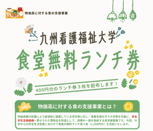 九州看護福祉大学では、本学に所属するすべての学生(学部生、助産学専攻科生、大学院生)に対し、物価高騰の影響を受ける学生の食費支援を目的とし、「物価高に対する食の支援事業」として食堂無料ランチ券配布を実施しました。