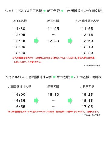 一般選抜(前期日程)の本学会場(2月3日実施)は、玉名駅・新玉名駅から会場まで無料シャトルバスを運行いたします。本学会場での受験を希望する受験者の皆さんはご利用ください。なお、当日は食堂の利用ができませんので、昼食は各自ご用意ください。