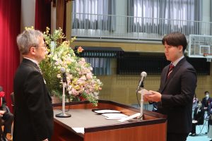 また、在学生の代表から卒業生・修了生へ感謝と激励の送辞を述べると、学部卒業生の代表が「この4年間を振り返ると、多くの学びと貴重な経験を積むことができ、非常に有意義な時間であった。」と学生生活を振り返るとともに、家族や関係者への感謝の言葉を述べました。